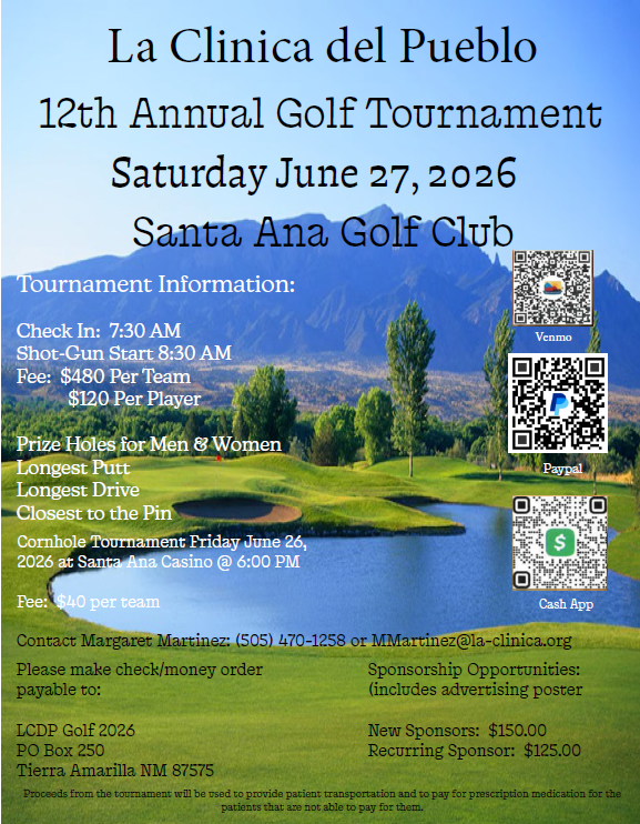This year’s tournament will be held at the beautiful Santa Ana Golf Club, located at Santa Ana Pueblo NM. The tournament format is a 4-man scramble. Golf carts will be made available for players and La Clinica staff only. Lunch will be provided for all players.
